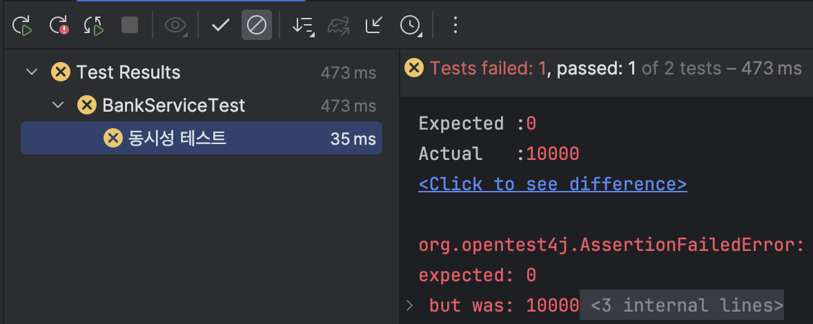 기대한 결과로는 두 스레드가 각각 10,000원씩(총 20,000원)이 차감되어 0원이 출력되어야 하지만, 실제로는 10,000원만 차감된 것을 확인할 수 있습니다.