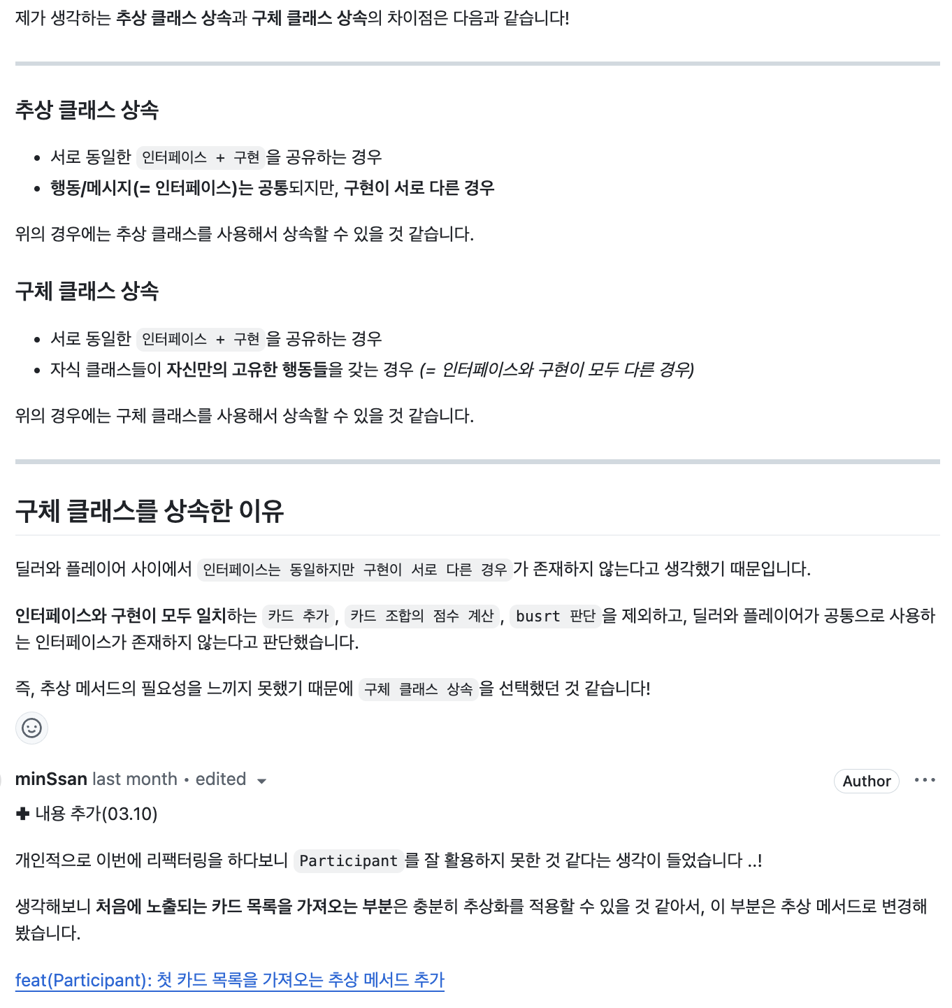 - 또한, 이번 미션에서는 오히려 상속을 적용했을 때 두 클래스를 Participant 타입으로 묶음으로써 카드와 관련된 로직(덱에서 카드 분배하기 등)을 공통으로 처리할 수 있었다.
